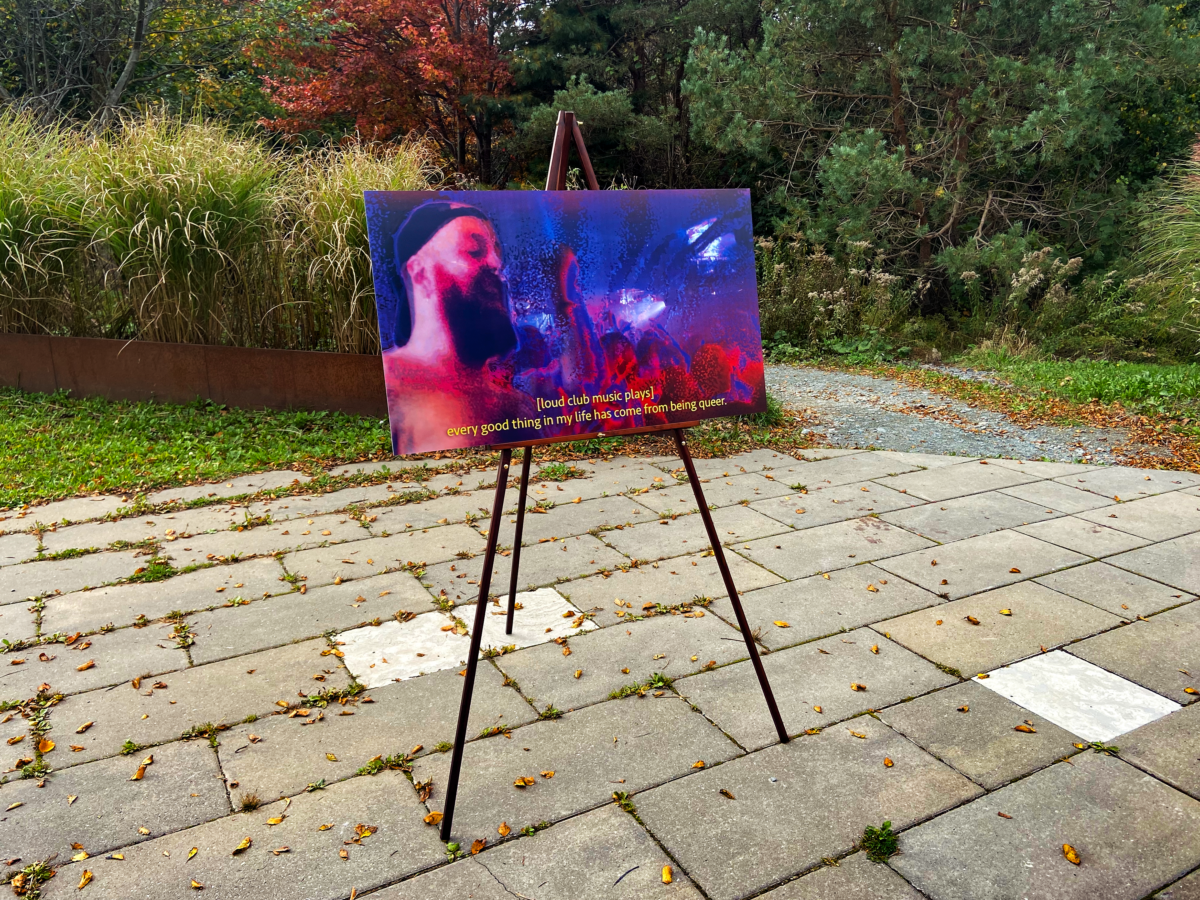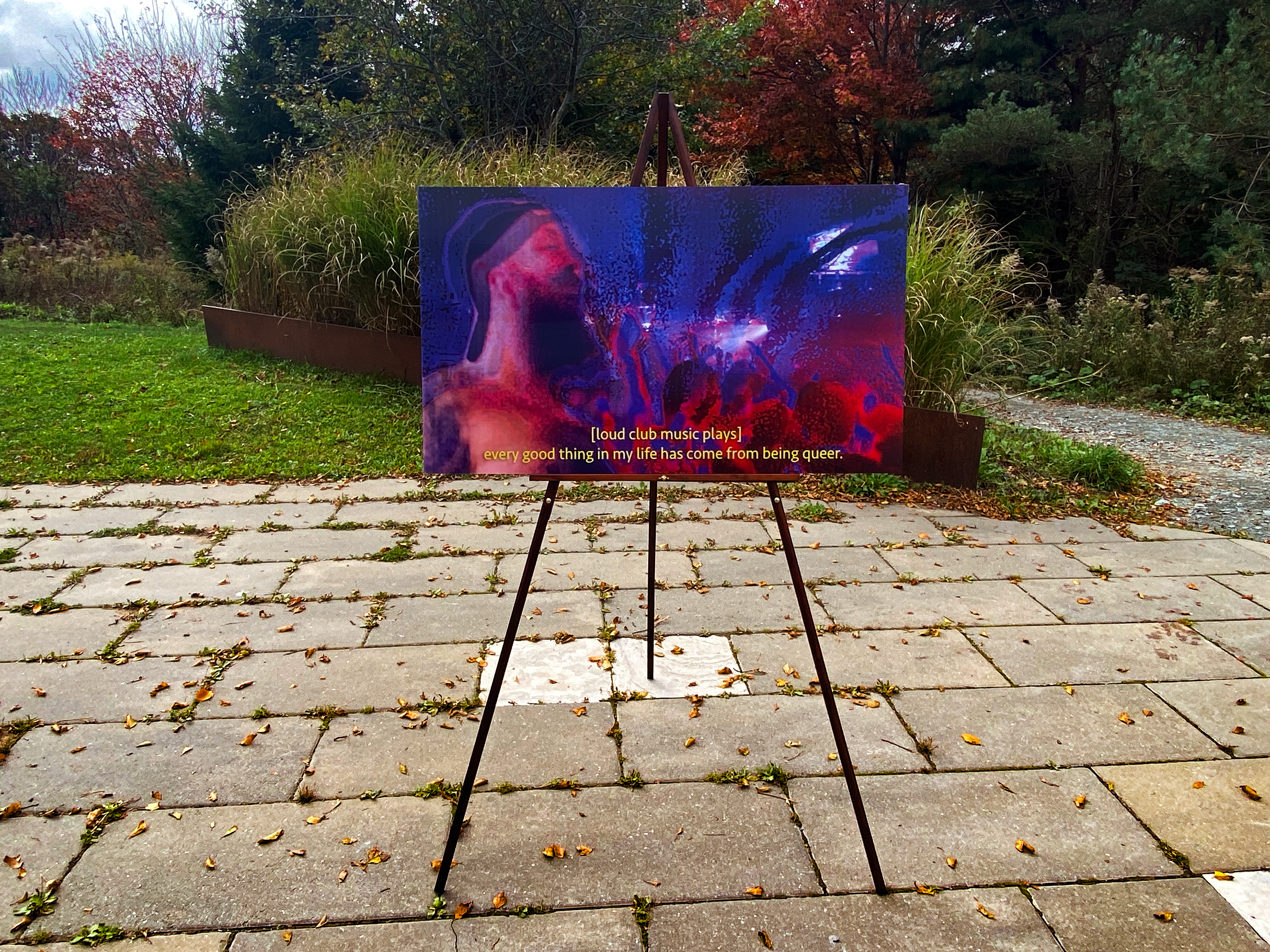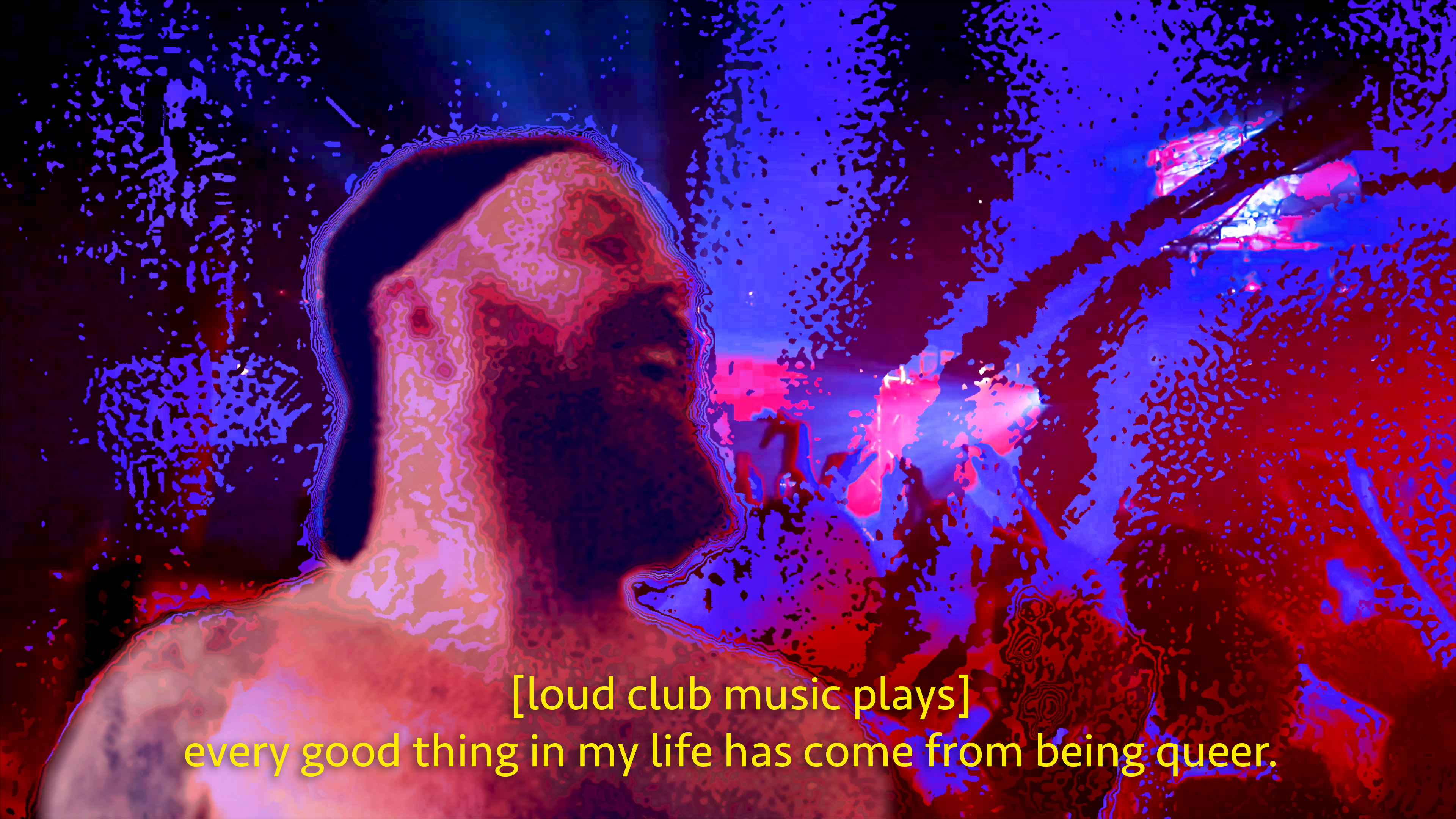 every good thing in my life has come from being queer. is a lenticular print depicting a man dancing in a nightclub, accompanied by a subtitled, truncated quote from author Andrea Lawlor.
